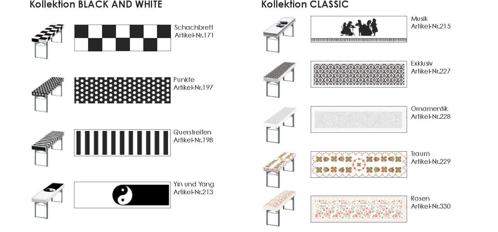 Hochwertige, stoffähnliche Papiertischdecke, Eventtischdecke für Bierzelttisch mit verschiedenen Motiven: Schachbrett, Punkte, Querstreifen, Ying & Yang, Musik, Exklusiv, Ornamentik, Traum, Rosen.