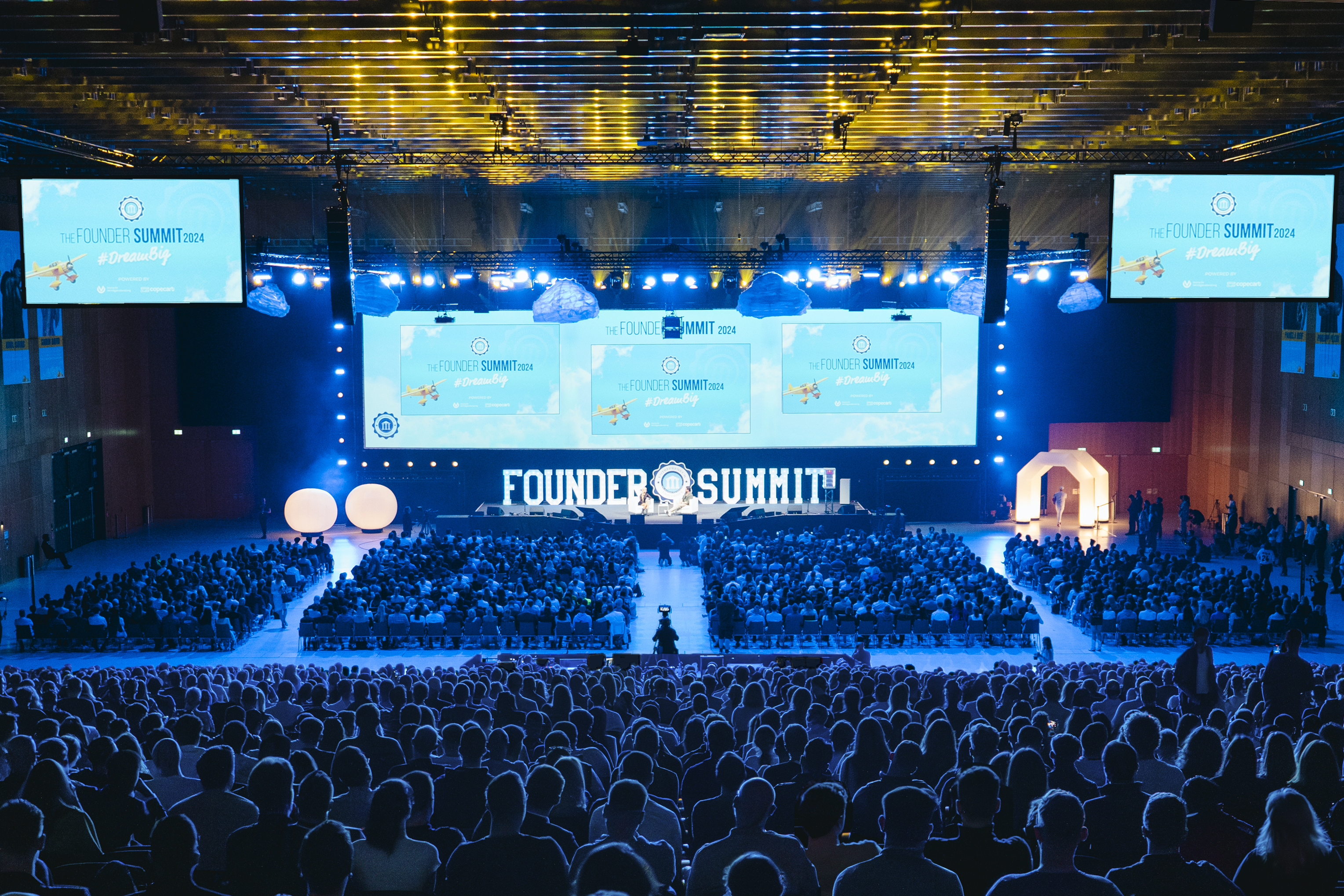 Hier sehen sie die aufblasbaren airglobe und airpass rechts und links der Bühne. Airpass bietet ein schönes Entree auf die Bühne zum Founder Summit 2024