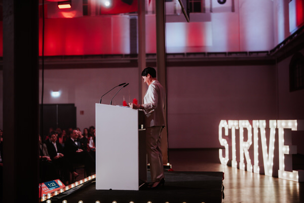 Im Hintergrund sehen sie die 150cm großen XXL Leuchtbuchstaben. Passend zum Thema Zirkus und dem Musical Greatest Show. Eingesetzt auf dem Strive Award 2025