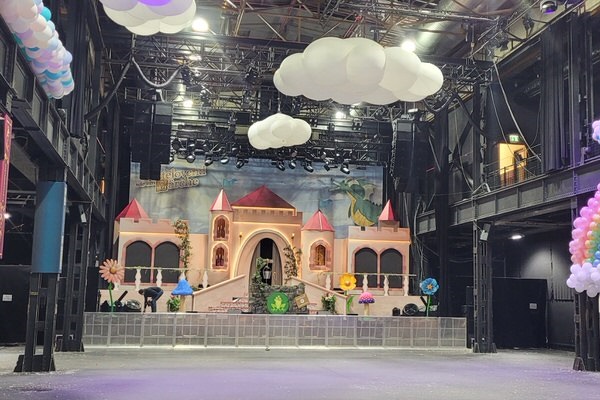 Sie sehen ein Schloss als Bühnendekoration und an der Decke hängen die riesigen aufblasbaren Wolken CLOUD in den Größen 3m und 5m
